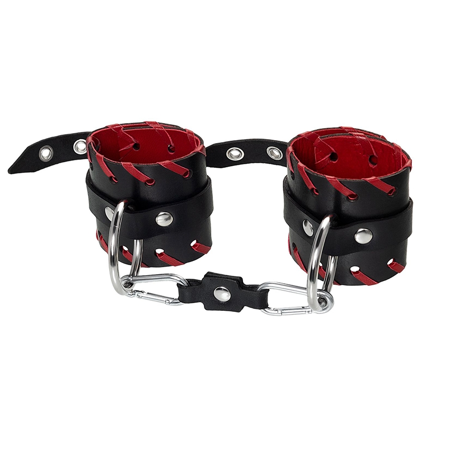 Эти двухслойные кожаные наручники с окантовкой красного цвета помогут реализовать ваши желания. Они оснащены двумя карабинами и кольцами, что позволяет использовать их как аксессуары-манжеты или наручники для фиксации. Широкие металлические кольца также позволяют прикрепить другие аксессуары с помощью карабинов.