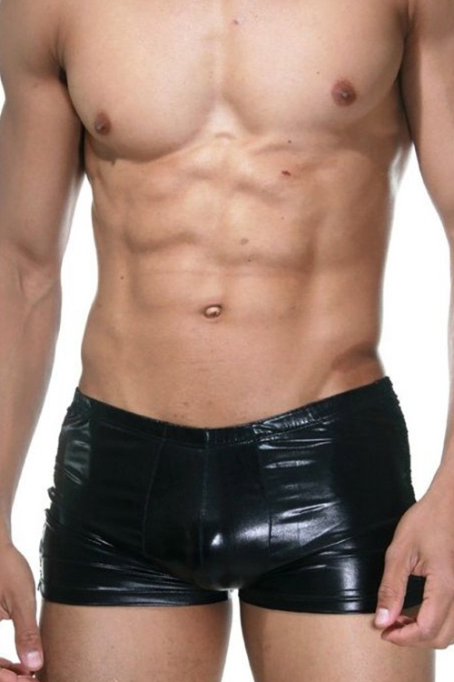 Эротические чёрные боксеры низкой посадки выполнены из гладкого материала под экокожу. По бокам вставки из ажурного кружевного полупрозрачного материала.